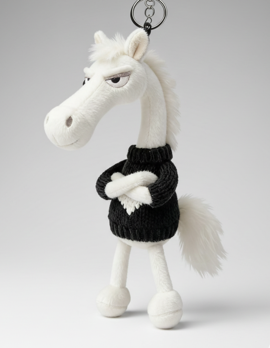 Fedezd fel a Merész ló kulcstartót, a tökéletes kiegészítőt mindenkinek, aki értékeli a humoros és egyedi dolgokat! Ikonikus „morcos” kifejezésével és stilizált dizájnjával ez a plüssállat bármilyen táskát vagy kulcscsomót különlegessé varázsol.